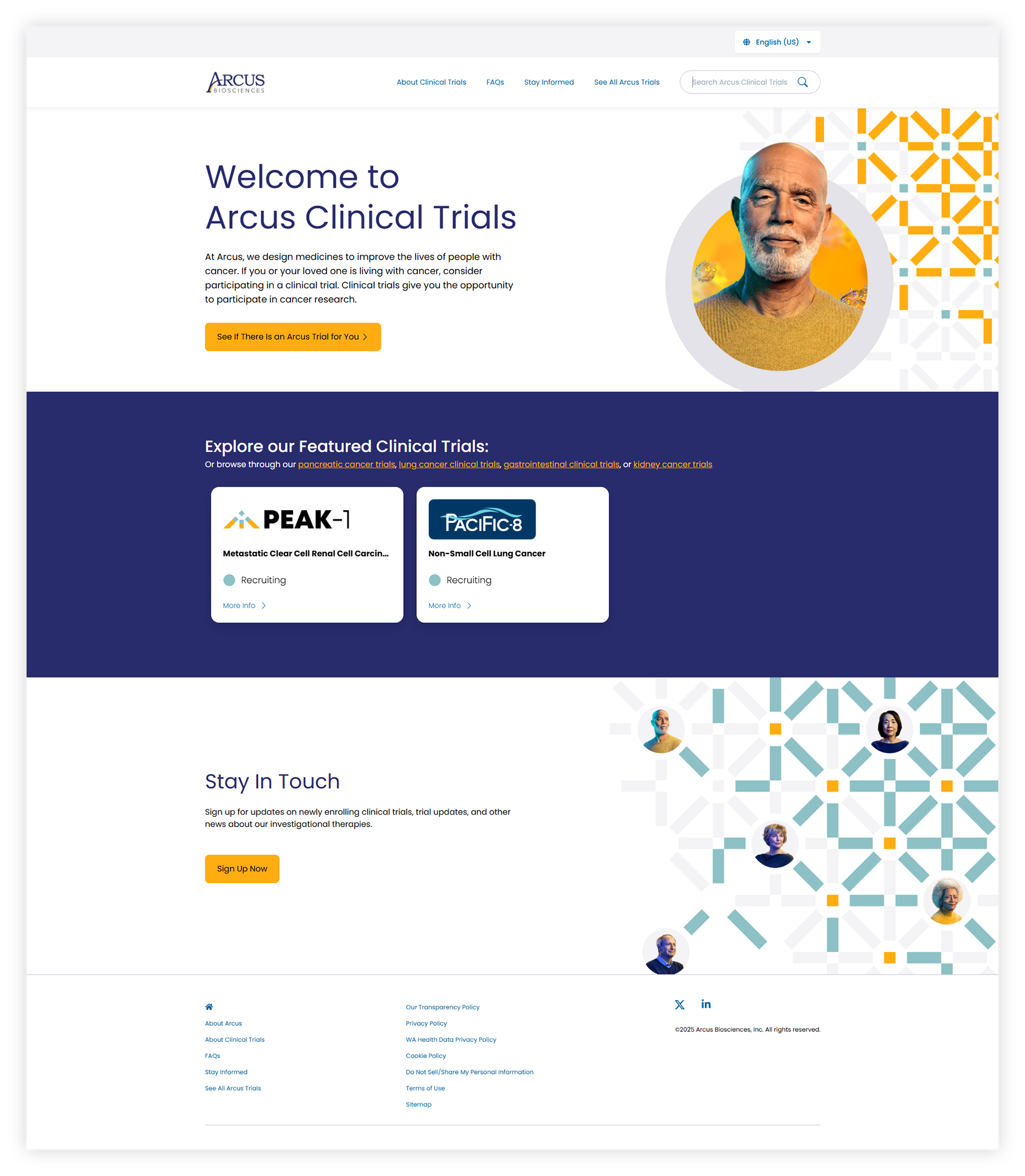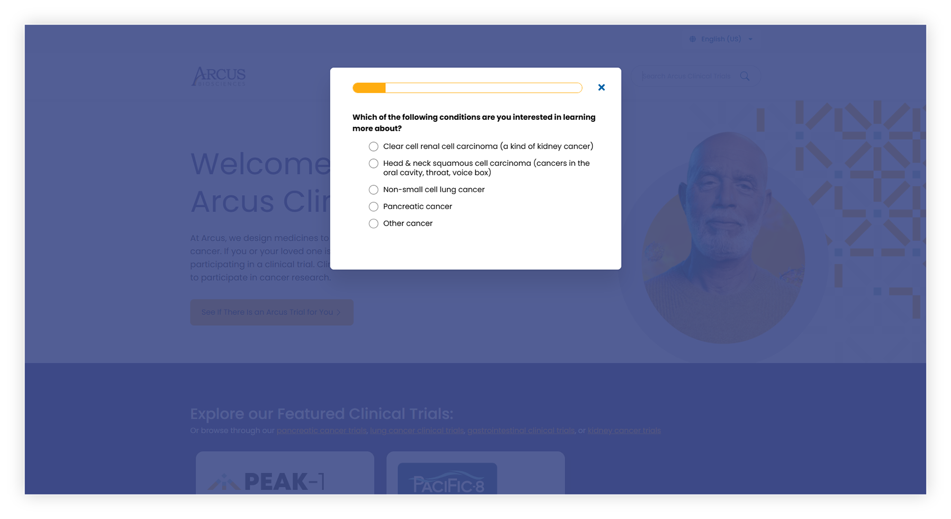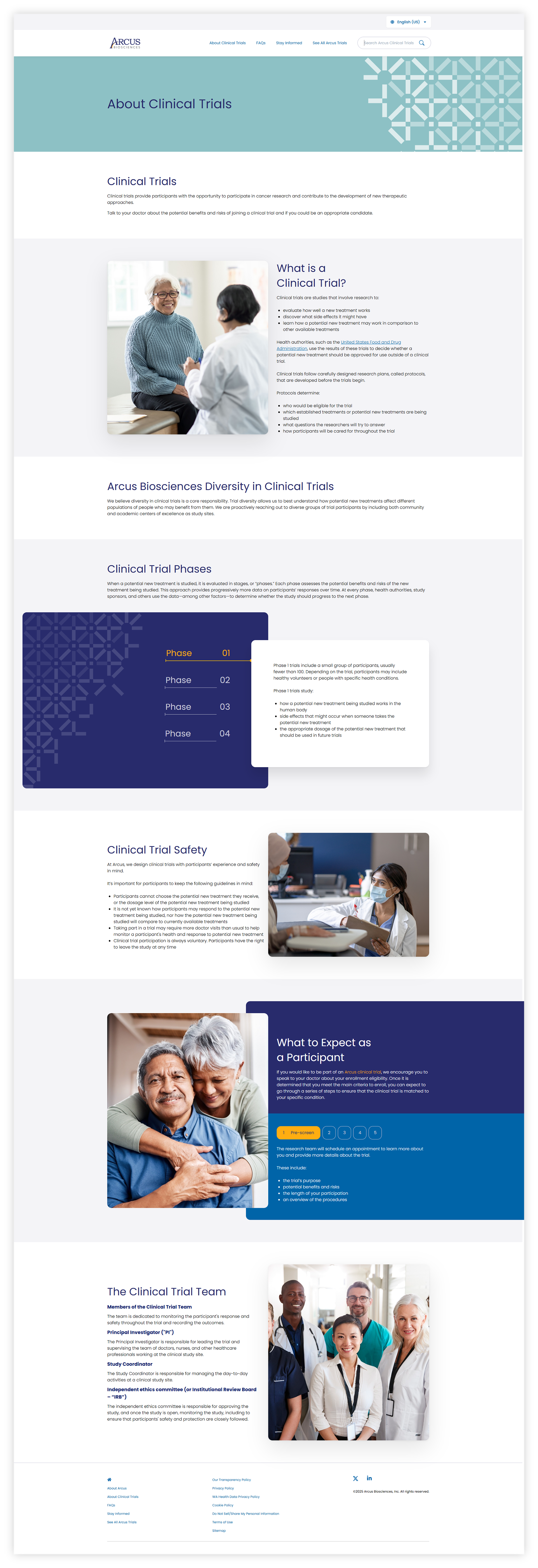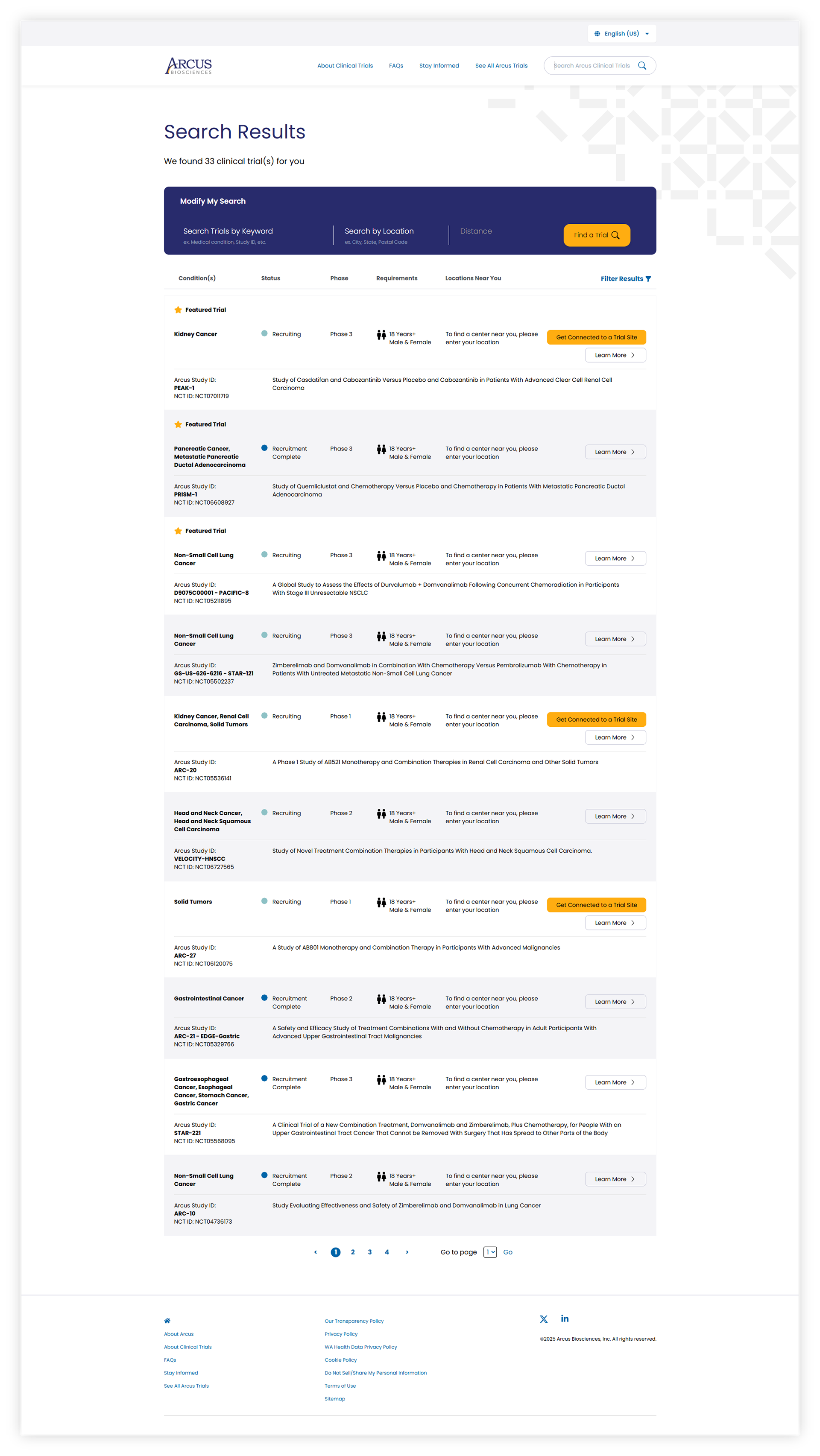 Arcus wanted a dedicated site to help users explore their ongoing clinical trials and easily find studies they may qualify for. I supported the project by refining user flows, contributing to the screener design, and helping improve the browsing experience for trial listings. The result was a clear, approachable platform that makes it easier for users to learn about and connect with Arcus trials.
