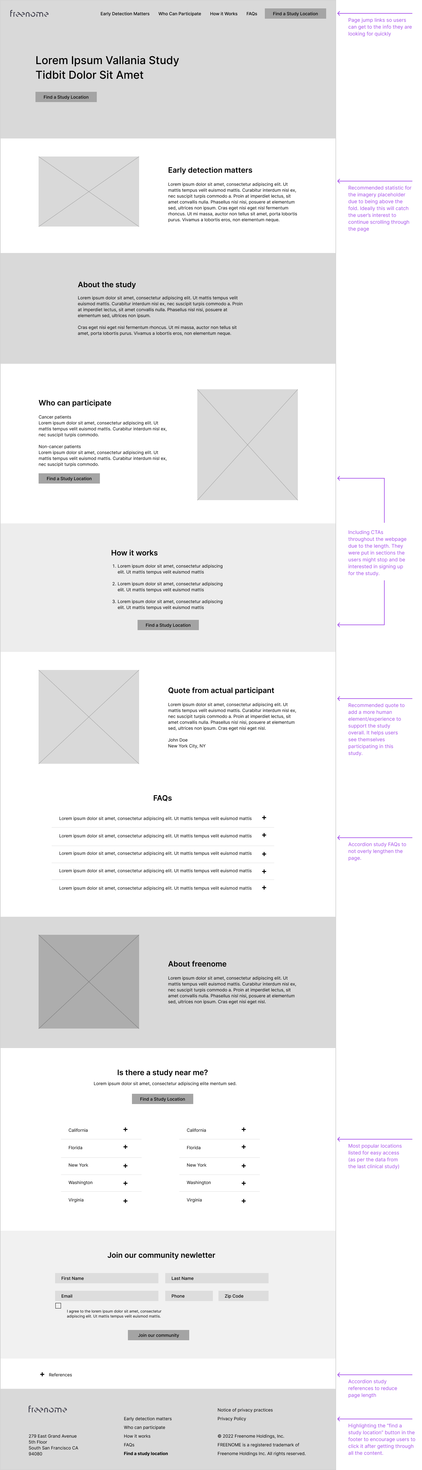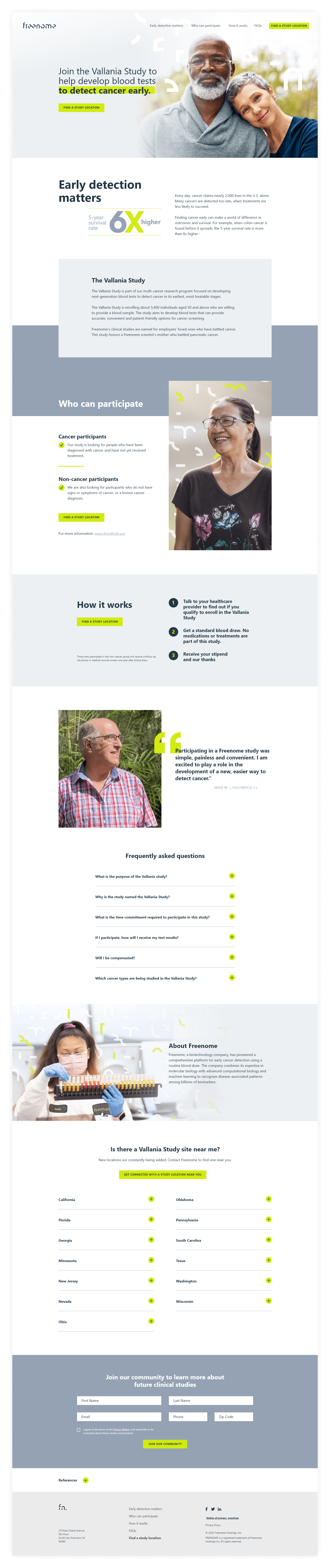 Building on Freenome’s existing brand system and design patterns from previous clinical trial pages, I created a layout that focused on conversion-driven design. Some key UX strategies I used while developing the wireframe were page jump links, using stats and quote from real people who participated in the trial, and CTAs throughout the piece to drive up conversion rates.